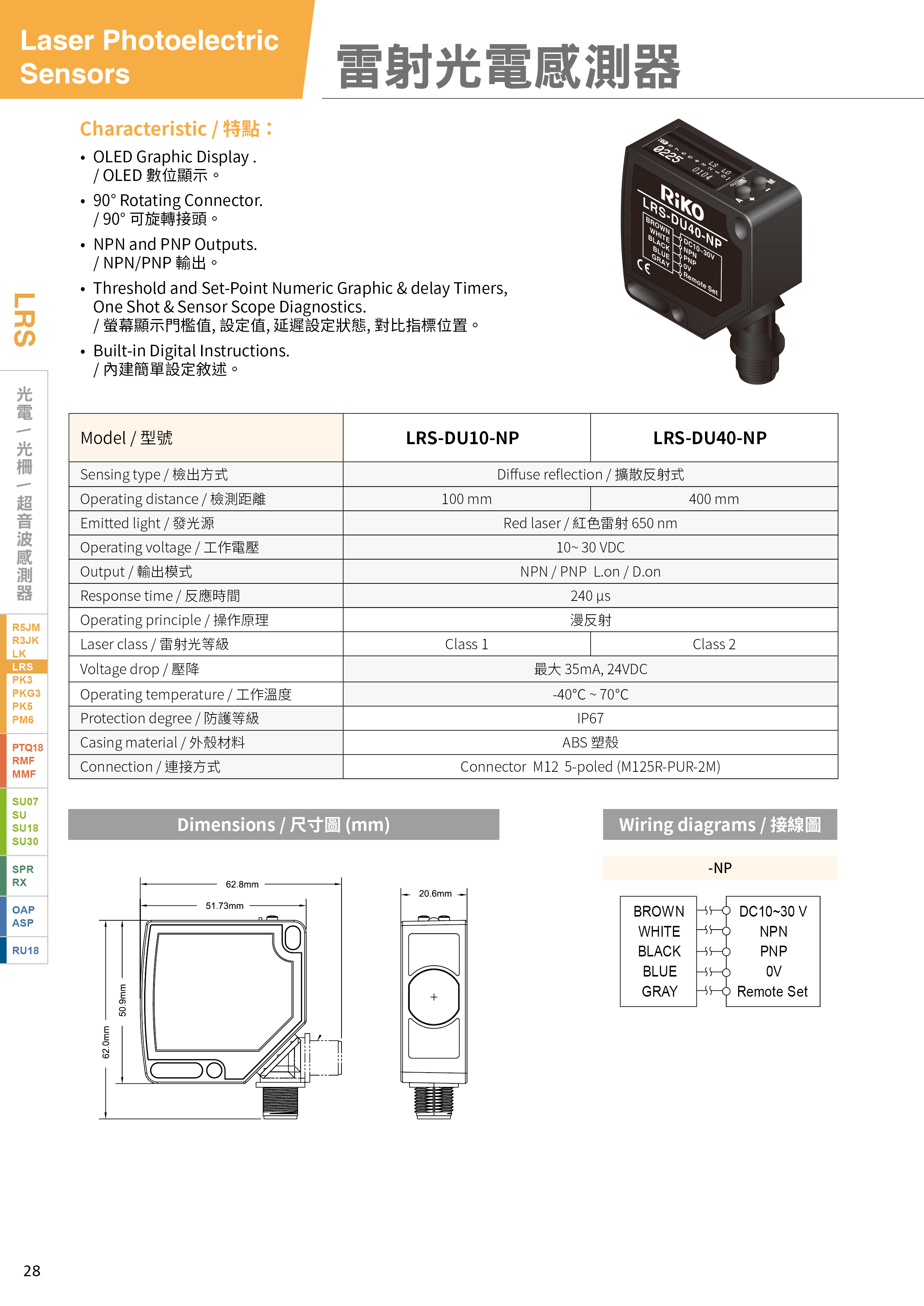 ·OLED 数位显示。 ·90° 可旋转接头。 ·NPN / PNP 输出。 ·防水等级IP67。 ·萤幕显示门槛值,设定值,延迟设定状态,对比指标位置。